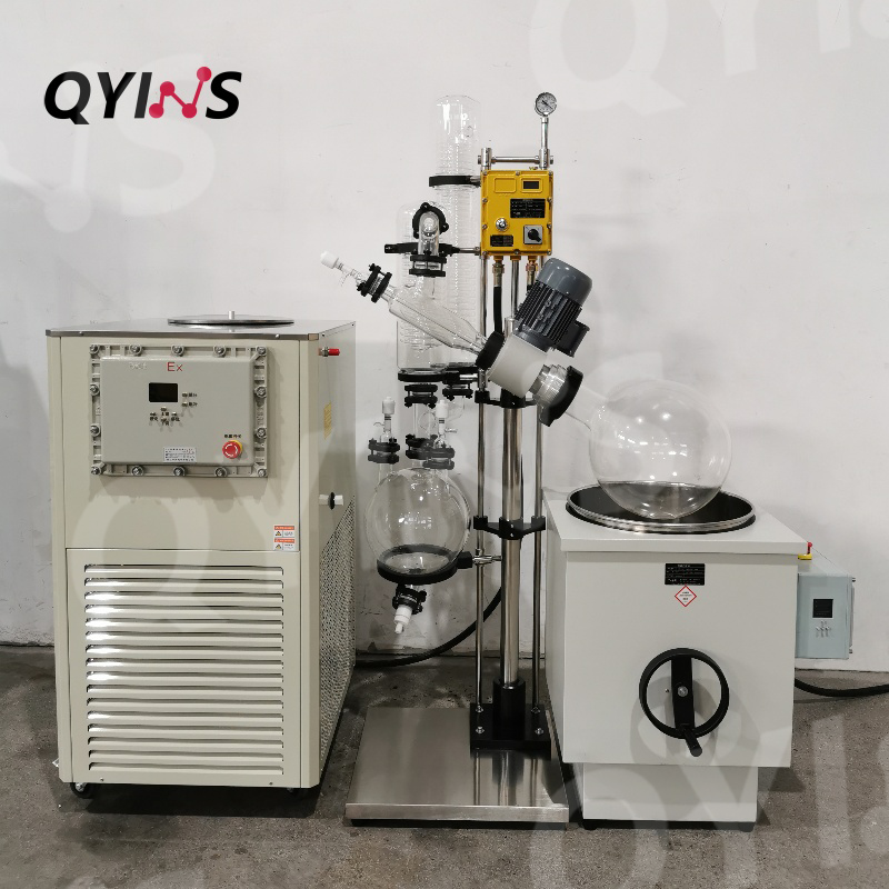 定制双冷凝器款防爆旋转蒸发仪 EX QYRE-20L(容量可定制1~100L) 采用大容量,大口径旋转蒸发瓶,蒸发面积大,在减压下置于水浴中,边旋转边加热,使溶液扩散蒸发 广泛应用于浓缩、干燥、提取等 化工、医药、食品常用设备 可配套真空泵、低温冷却液循环泵等