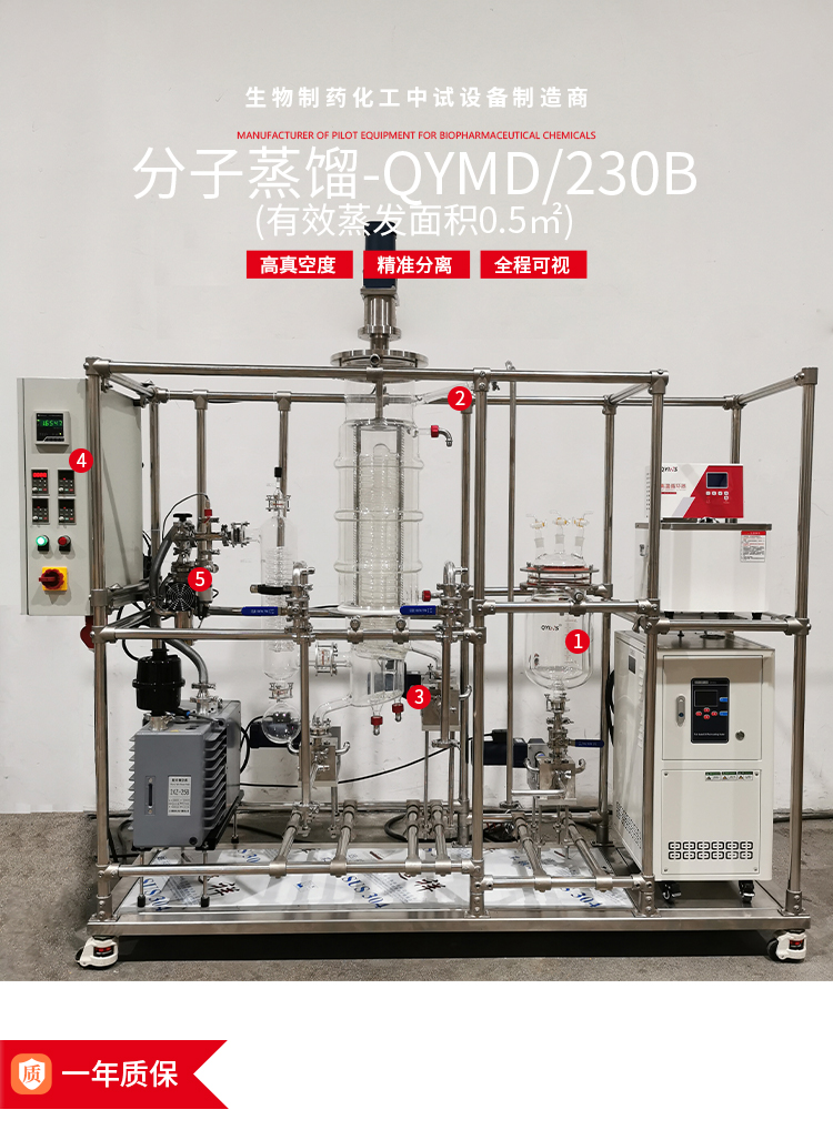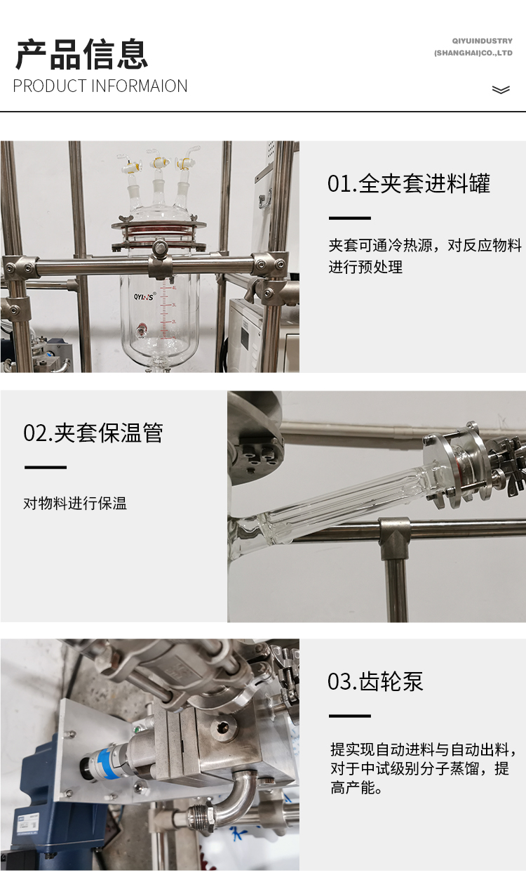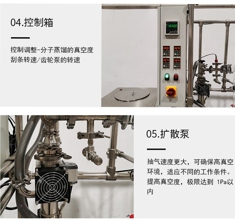 该分子蒸馏具备全夹套进料罐和夹套保温管,可确保物料温度稳定,减少热量损失,配备齿轮泵实现自动进出料,提高了生产效率和操作便利性,适用于多种物料的蒸馏处理,为工业生产带来高效、稳定的解决方案。