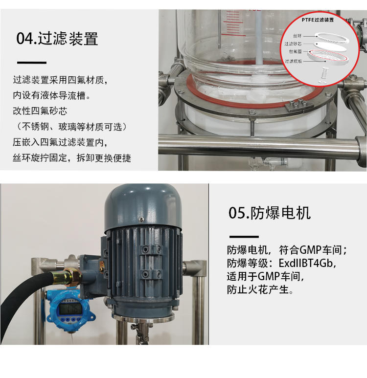 固相合成反应釜,可实现合成裂解固液分离过滤以及结晶等工艺要求,可与常规反应装置轻松组合。使用适当的过滤器分离浆液中的固体颗粒,形成成滤饼;滤液向下流动,从底部出口的阀门流出,过滤板多种材质,多种孔径可选