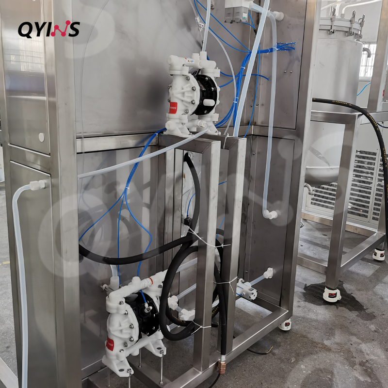 选用PP材质气动隔膜泵,使用压缩空气作为动力源,可以通过节流阀调节流量,适应不同物料的输送需求。