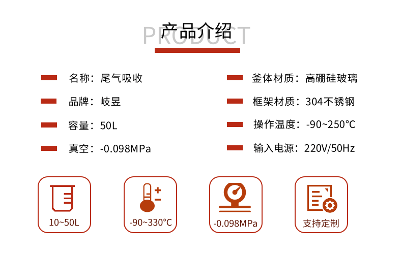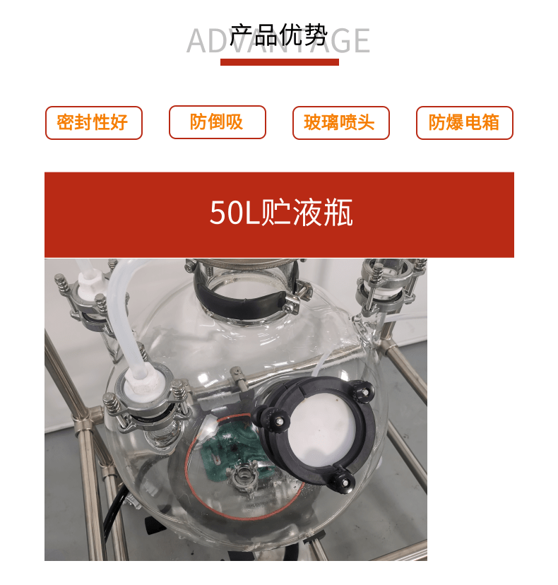 本款防爆尾气吸收,配备三个防倒吸罐。磁力循环泵将吸收液从圆底烧瓶打入喷淋头,从顶部落下。废气反方向进入吸收柱,两者充分接触后,快速达成净化。