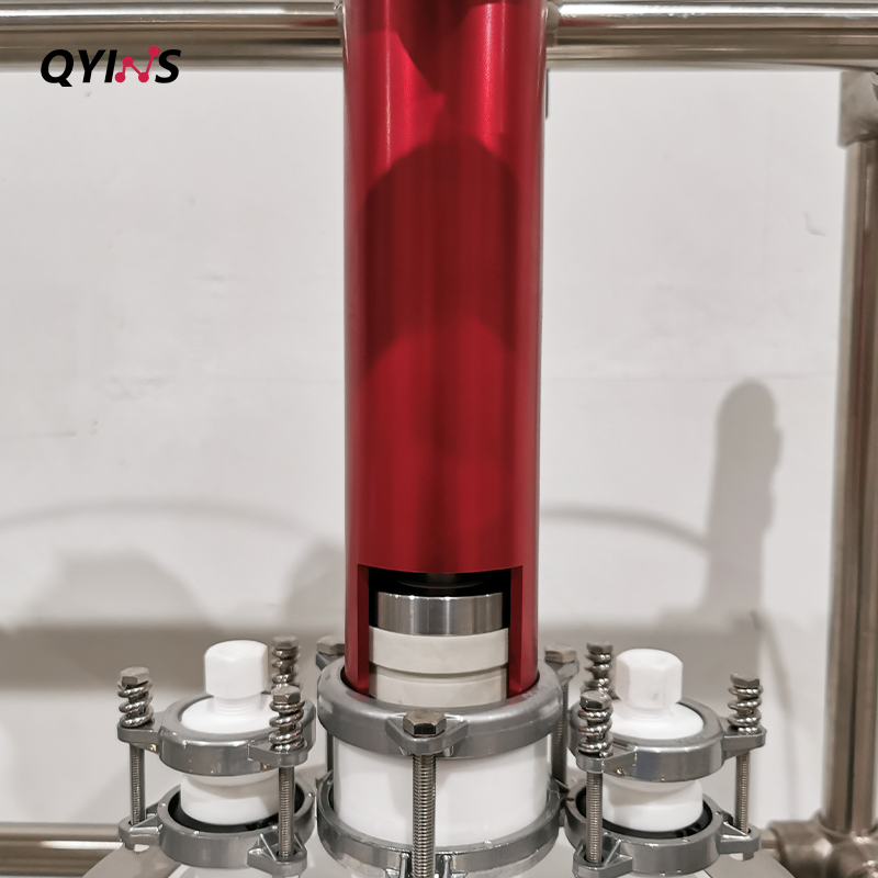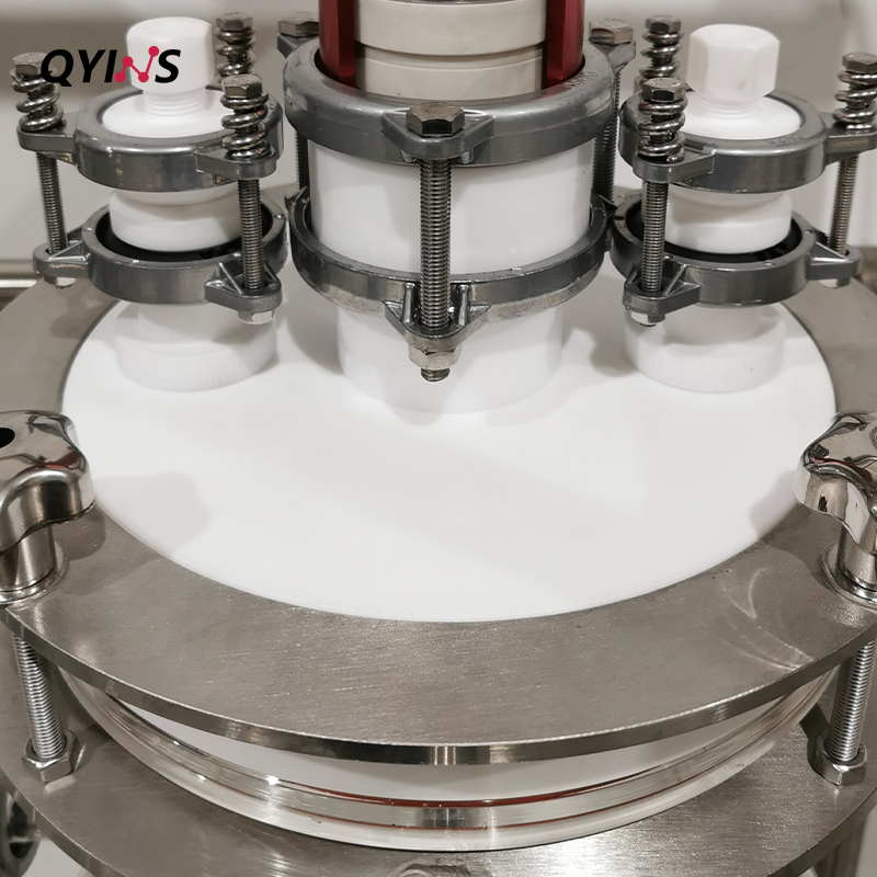 双层玻璃反应釜,组合设计,物料初步反应后,可通过釜体上方溢流口,留到第二个釜内,经过在第二个釜内反应可得到浓度更高的产品,减少人工操作的麻烦,四氟釜盖防腐耐酸,轴套式机械密封,搅拌更加稳固。